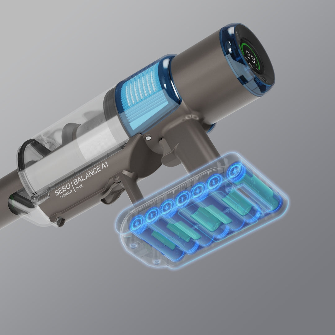 The SEBO Balance A1 is powered by a high-performance lithium-ion battery that delivers up to 48 minutes of continuous cleaning. It recharges quickly and efficiently, providing cordless convenience and consistent power for every cleaning task.