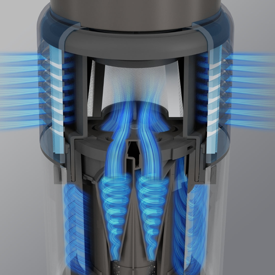 The cyclone technology and multi-stage filtration system deliver powerful, consistent suction while ensuring exceptionally clean exhaust air. A primary cyclone separates coarse debris, followed by six mini-cyclones, an advanced motor protection, and a micro-hygiene filter that capture fine dust and allergens - leaving your home cleaner and the air noticeably fresher.